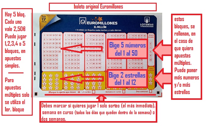 Puedes jugar apuestas múltiples de Euromillones en un sólo boleto; para ello debes marcar cinco números (siempre que rellenes más de dos estrellas), seis, siete, ocho, nueve, o diez pronósticos en el primer bloque y/o dos (siempre que elijas más de cinco números), tres, cuatro o cinco estrellas.