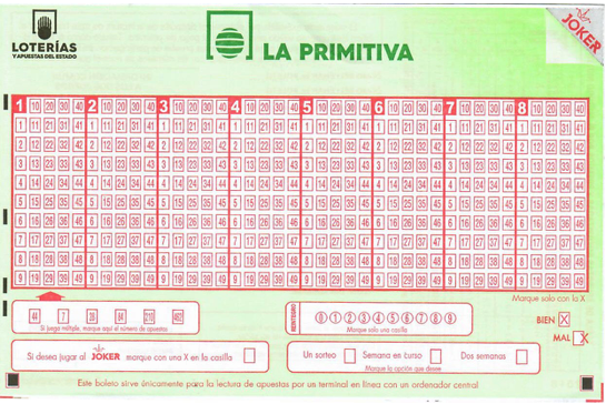 – Boleto original de la primitiva, Lleva adosado un juego adicional, optativo, llamado Joker, incrementando el precio de tu apuesta , en 1 euro más. Para participar debes marcar el signo x en la casilla denominada «Joker». Solamente se podrá asignar un número de 7 cifras por resguardo. Tiene diferentes categorías de premio desde 2 aciertos tanto por delante, como por detrás, hasta las 7 cifras, con un premio de 1.000.000 de euros.